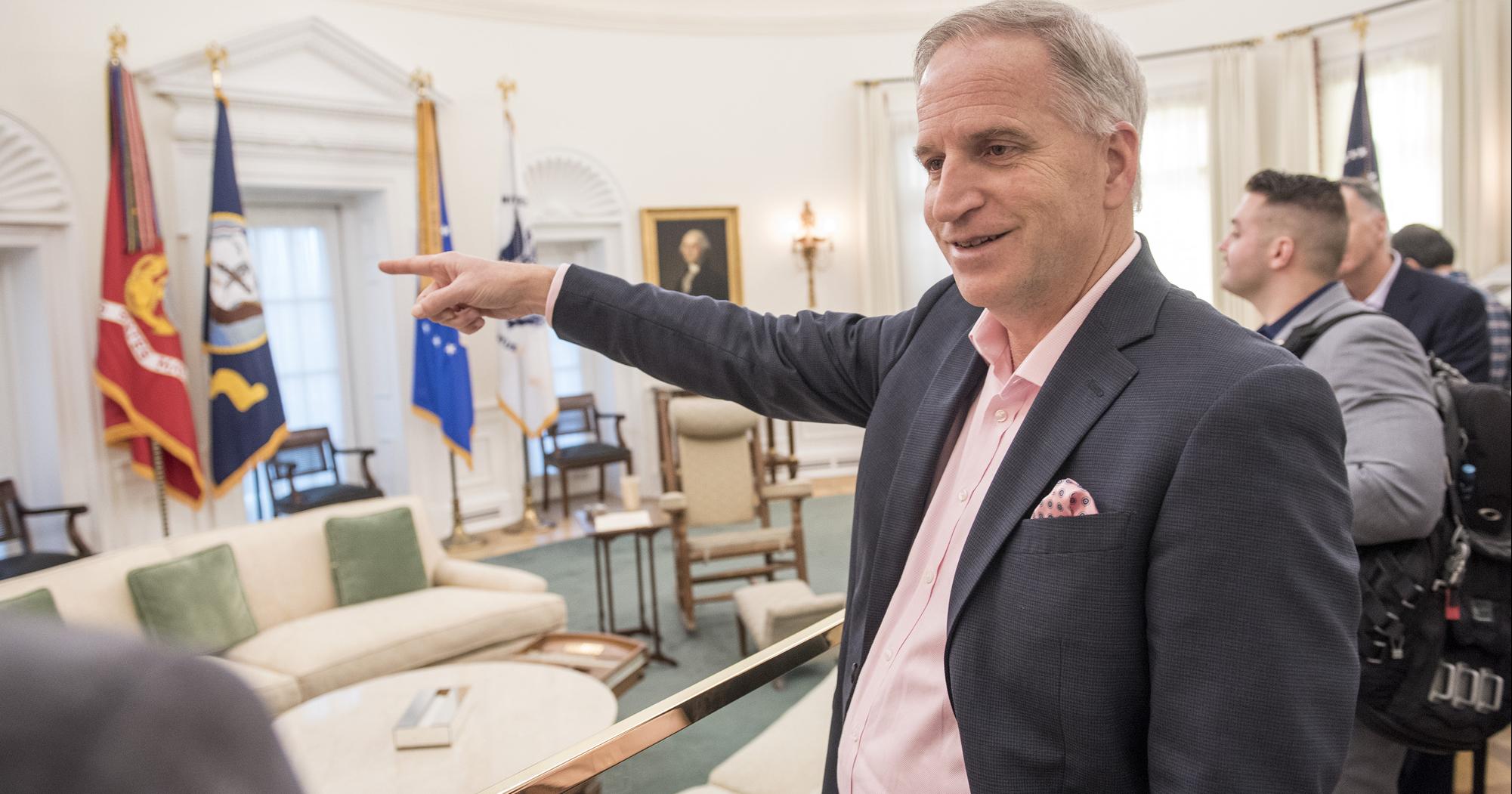 On Feb. 6, 2018, Robert Cardillo, director of the National Geospatial-Intelligence Agency, and agency Executive Director Ed Mornston, visited the library to view unclassified pages from the President's Daily Brief. LBJ Library Archivist Lara Hall facilitated the viewing.